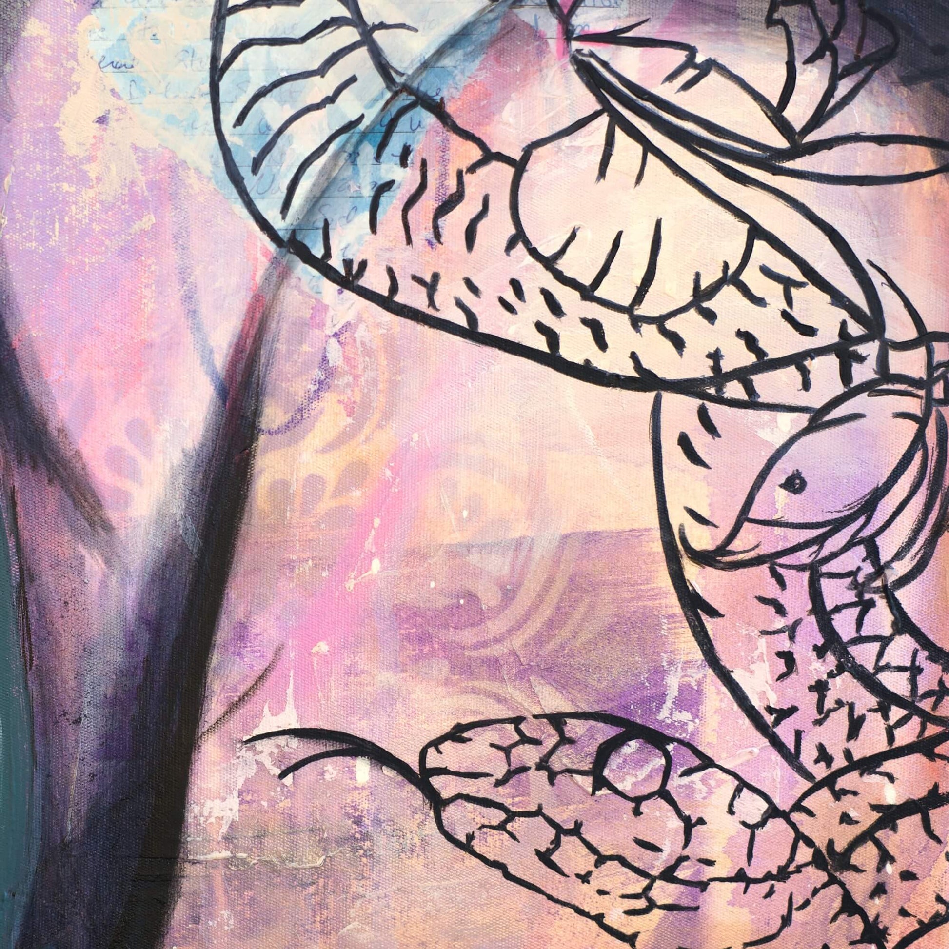 Butterflies rise from shadowed spaces, snakes watch with steady poise, and women stand, shoulders squared, hearts open, ready to inhabit the life they choose.