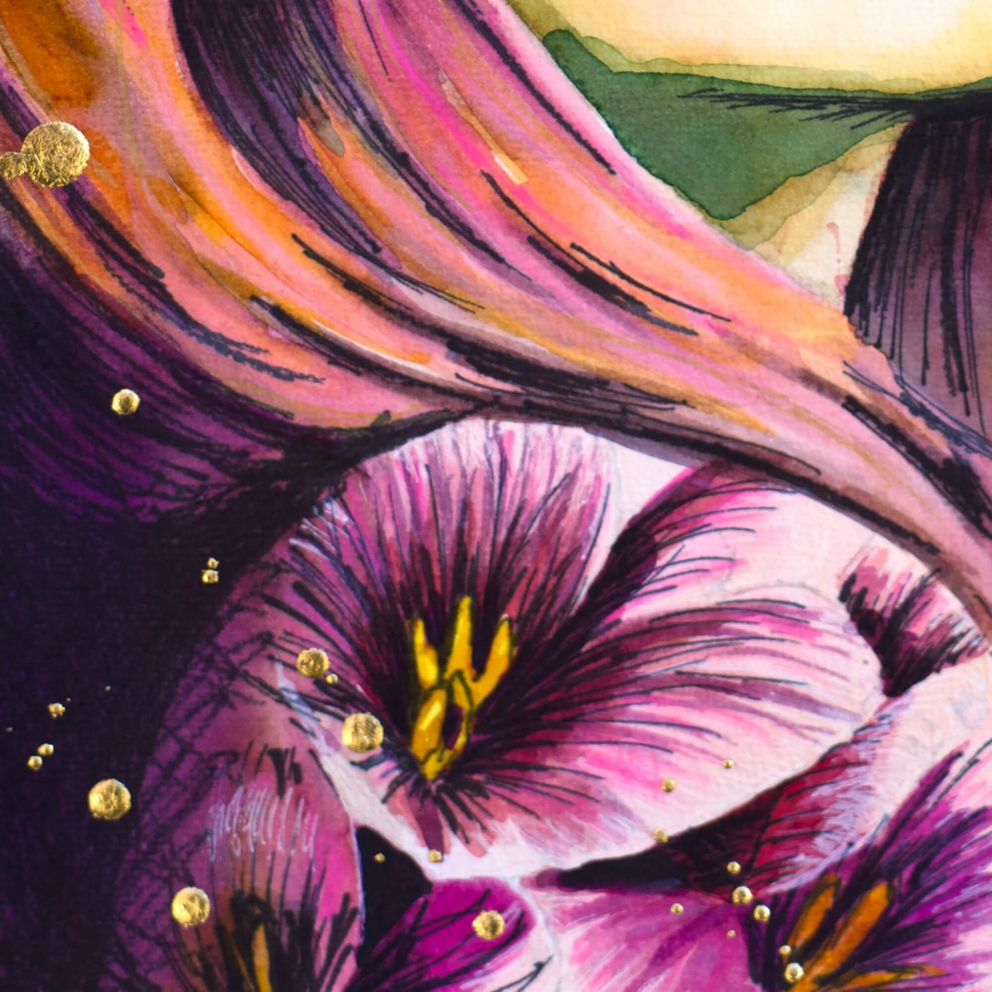 She blooms in fiery autumn tones, daring the world to notice her intensity. This painting embodies audacity, self-expression, and the radical act of showing up fully — a testament to the reclamation of one’s own presence and power.