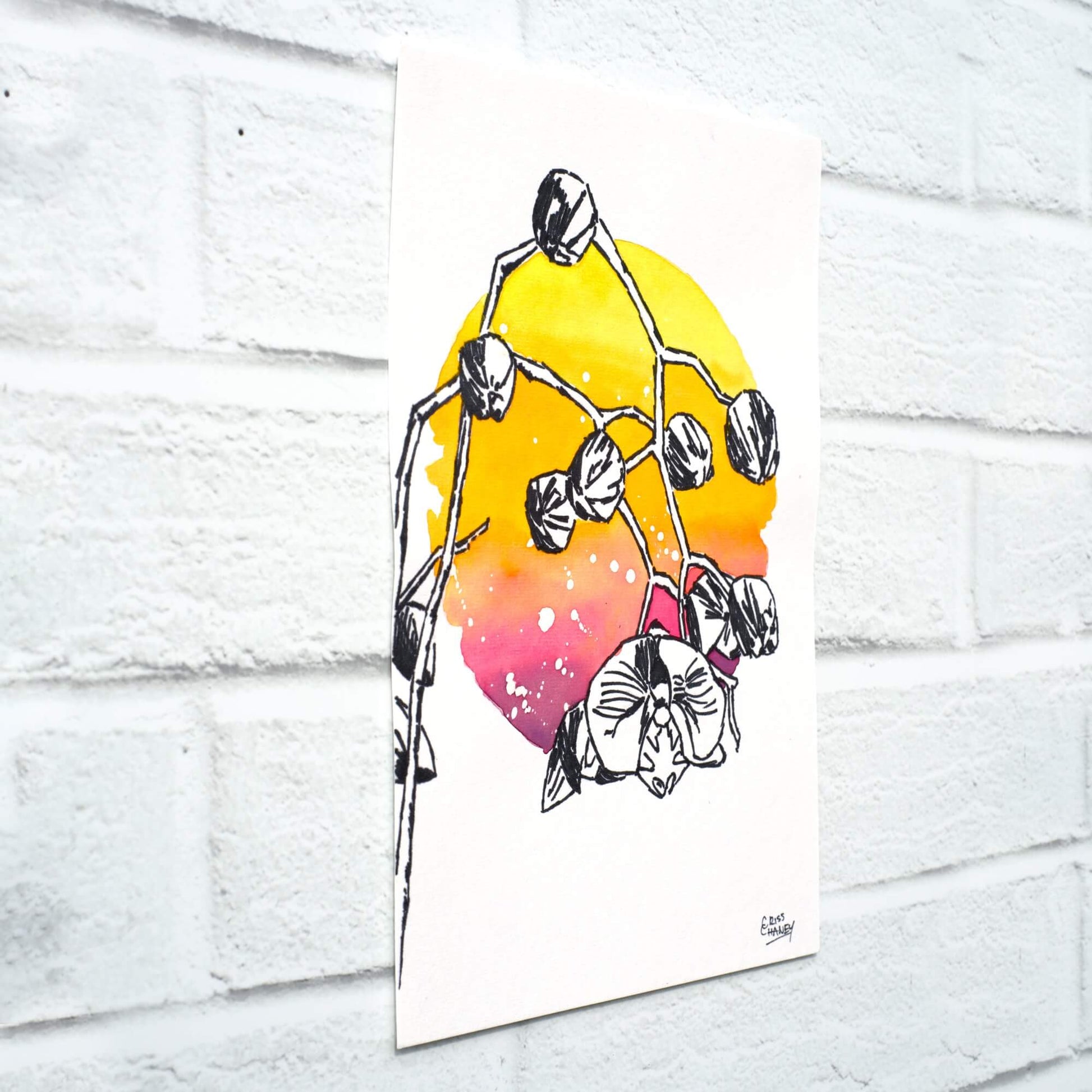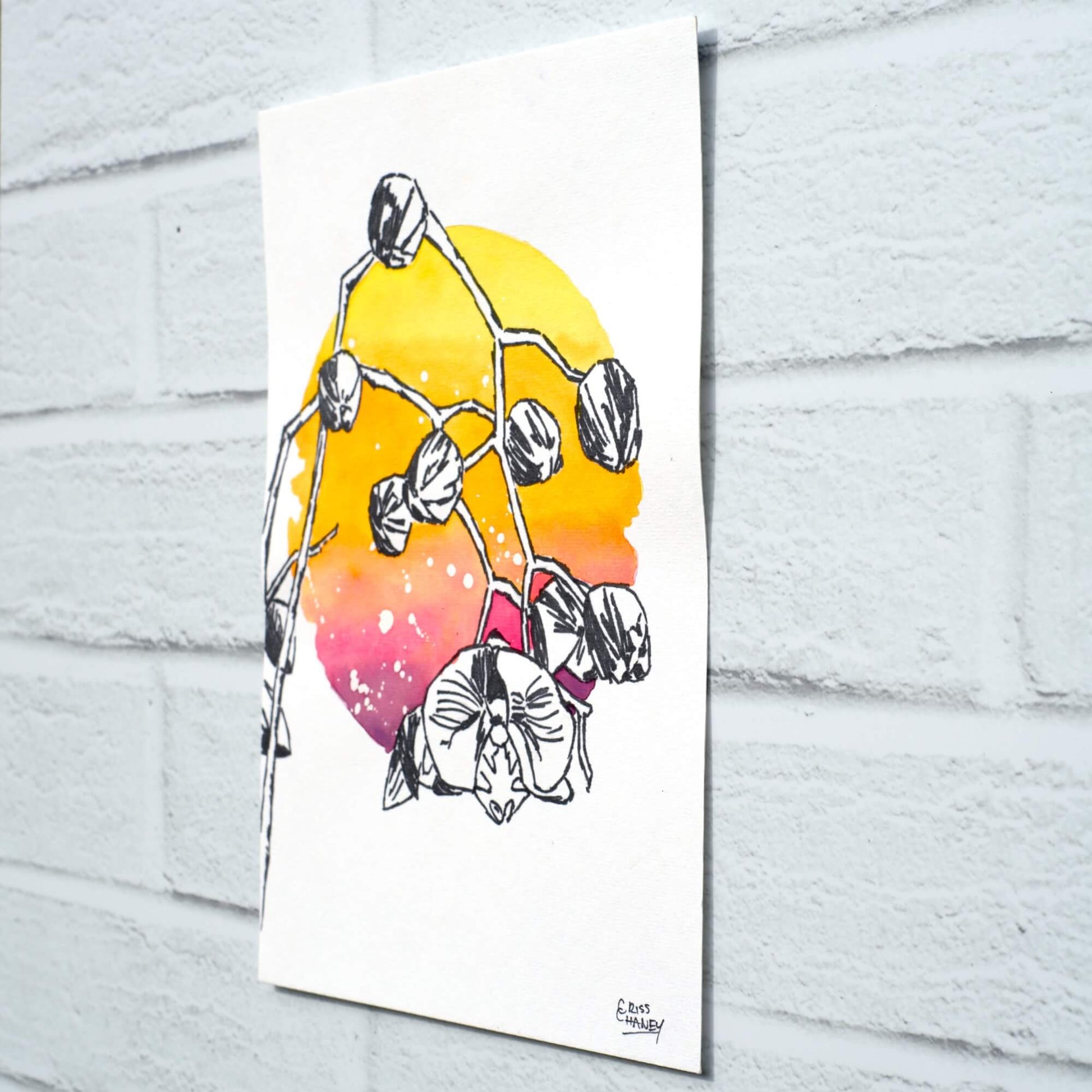 Hollow Me Out is an original watercolour painting where expressive black-and-white orchids emerge against soft, sunset-washed colour.